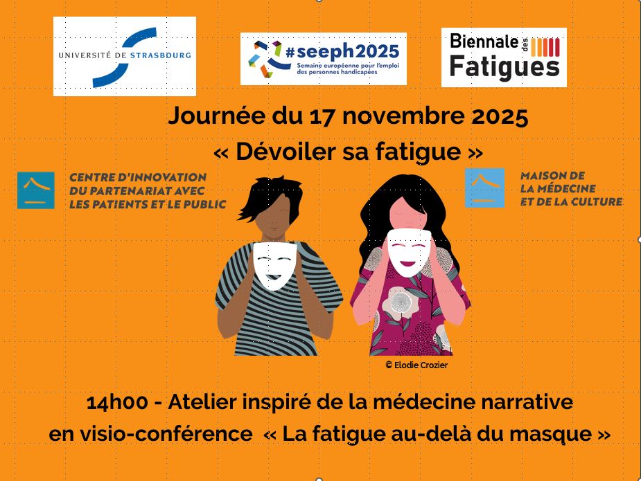 Atelier d’écriture inspiré de la médecine narrative : la fatigue au-delà du masque, animé par Karine Boyer (patiente partenaire avec le CI3P – CHU de Limoges) et Jean-Michel Benattar (Médecin, enseignant, coordinateur du Centre d’Innovation du Partenariat avec les Patients et le Public (CI3P), UniCA, Nice)