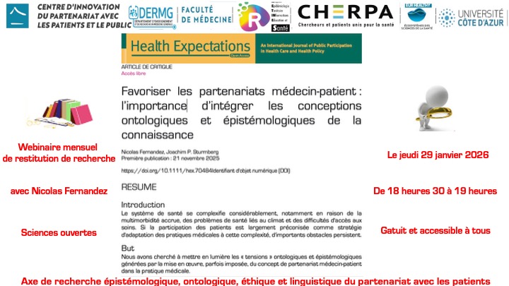 Le jeudi 29 janvier 2026, de 18 heures 30 à 19 heures 30 en webinaire ouvert à tous et gratuit, dans le cadre de la recherche initiée en septembre 2024 lors du 4ème colloque international sur le partenariat de soin avec les patient à Lyon sur la recherche épistémologique, ontologique, éthique et linguistique sur le partenariat patient entre le Centre d’Innovation du Partenariat avec les patients et le public (CI3P) de la faculté d’Université Côte d’Azur (Luigi Flora, David Darmon, Jean-Michel Benattar), le centre de pédagogie appliquées des sciences de la santé (CPASS), de la faculté de médecine et de l’Institut de recherche en gériatrie (IUGM) de l’Université de Montréal (Nicolas Fernandez), du centre de recherche Apprenance, Formation, Digital (Cref, UR 1589 / UFR SPSE) de l’université de Nanterre (Olivier Las Vergnas), le CHUV du canton de Vaux à Lausanne (Béatrice Shaad-Noble) et l’Université de Louvain (Catherine Dans), et après un premier article publié dans la revue le partenariat de soin avec le patient: analyses en sciences ouvertes au sein d’épisciences sur une cartographie linguistique des articles publiés dans la 1ère revue dédiée au partenariat, Nicolas Fernandez, chercheur de l’université de Montréal présentera une synthèse de l’article