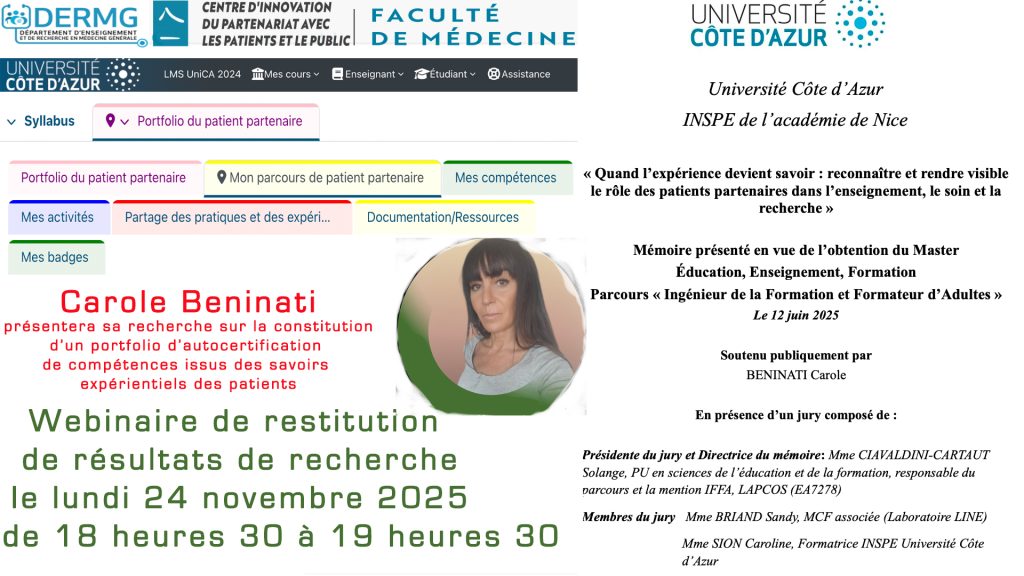Le 1er webinaire de ce nouveau cycle organisé à partir d’une thèse de médecine générale portant sur l’étude d’impact d’un tandem de partenariat médecin patient au sein d’une Maison de Santé Pluri-professionnelle, elle même membre dune Communauté Pluri-professionnelle Territoriale de Santé (CPTS)Il porte sur la restitution de travaux de recherche menés avec le Centre d’Innovation du Partenariat avec les Patients et le Public (CI3P) et Département d’Enseignement et de Recherche en Médecine Générale (DERMG) d’Université côte d’Azur avec pour initier ce cycle mensuel de restitution de recherches menées avec le CI3P .