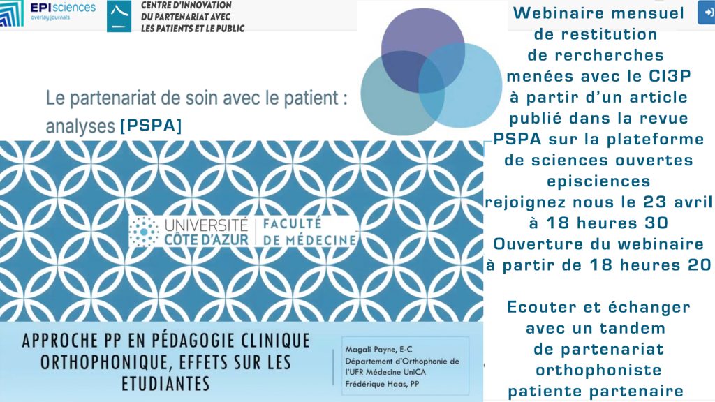 Dans le cadre des projets d’impacts sociales de la formation à l’Art du Soin en partenariat proposée tant à la faculté de médecine d’Université Côte d’Azur, qu’en ligne, par le Centre d’Innovation du partenariat avec les patients et le Public (CI3P), un réel curriculum d’enseignement du partenariat de soin avec le patient a été conçu par un tandem de partenariat orthophoniste enseignante- patiente partenaire à la faculté de médecine de Nice.